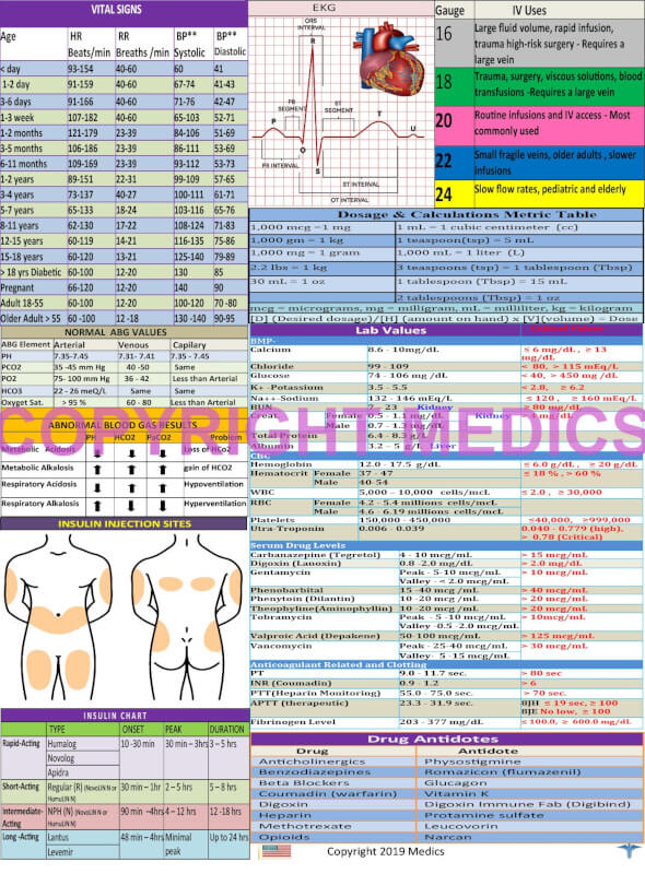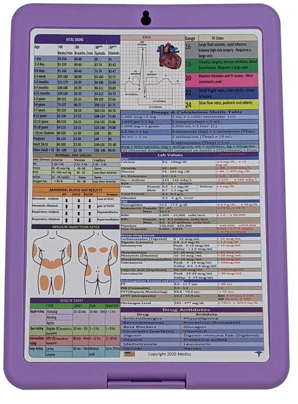 - Backside & Inside quick references to information such as: IV Gauges,Normal ABG values, Critical Values,EKG chart ,etc..
